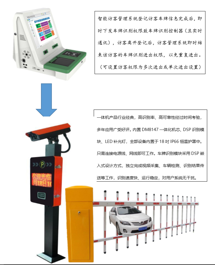車牌識別一體機系統針對臨時來訪人員的不可預知性帶來的管理問題而專門設計,能夠使登記工作變得方便快捷、登記信息更加完整,更加快速有效查詢來訪記錄,使其成為綜合訪客管理系統的一個重要組成部分。適用于各級政府機關、科研機構、司法部門、部隊、監獄、企事業單位、銀行、賓館、民航、院校、酒店、小區等各單位的保衛部門,用于對來訪者進行登記與管理。
