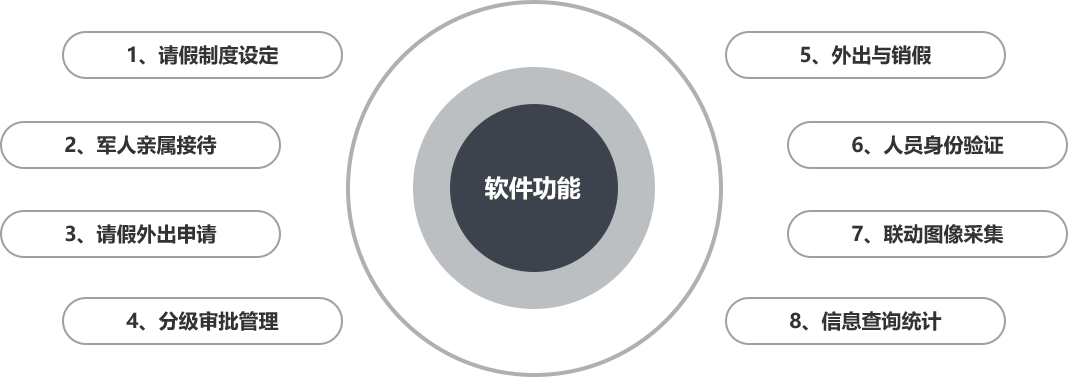 人員管理包括:長期人員(軍人,家屬,職工等)進出,請假申請,請假審批,請假銷假等管理,外來訪客進出管理。